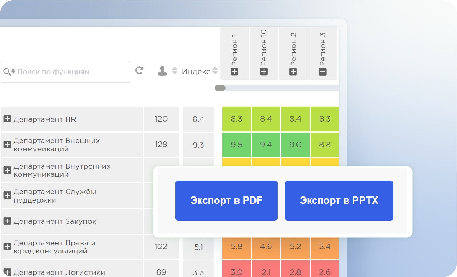 Выгрузка «в 1 клик» отчетов в PPT, PDF, Excel.
