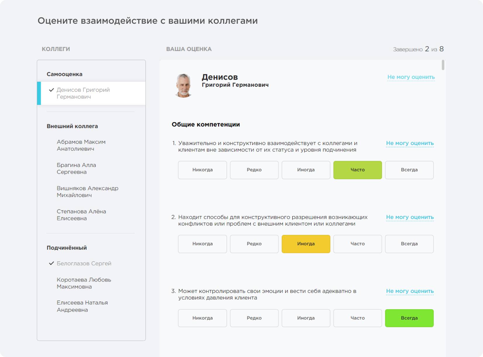 Можно оценивать коллег в любом порядке или выйти из опроса и продолжить позже