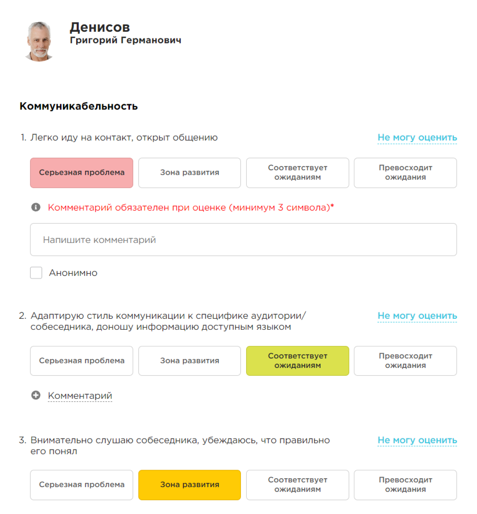 Отчет с комментариями реструктурирован для большей наглядности. Здесь собрана прямая речь окружения сотрудника, сгруппированная по критериям оценки и открытым вопросам, которые задавались респондентам в ходе исследования.