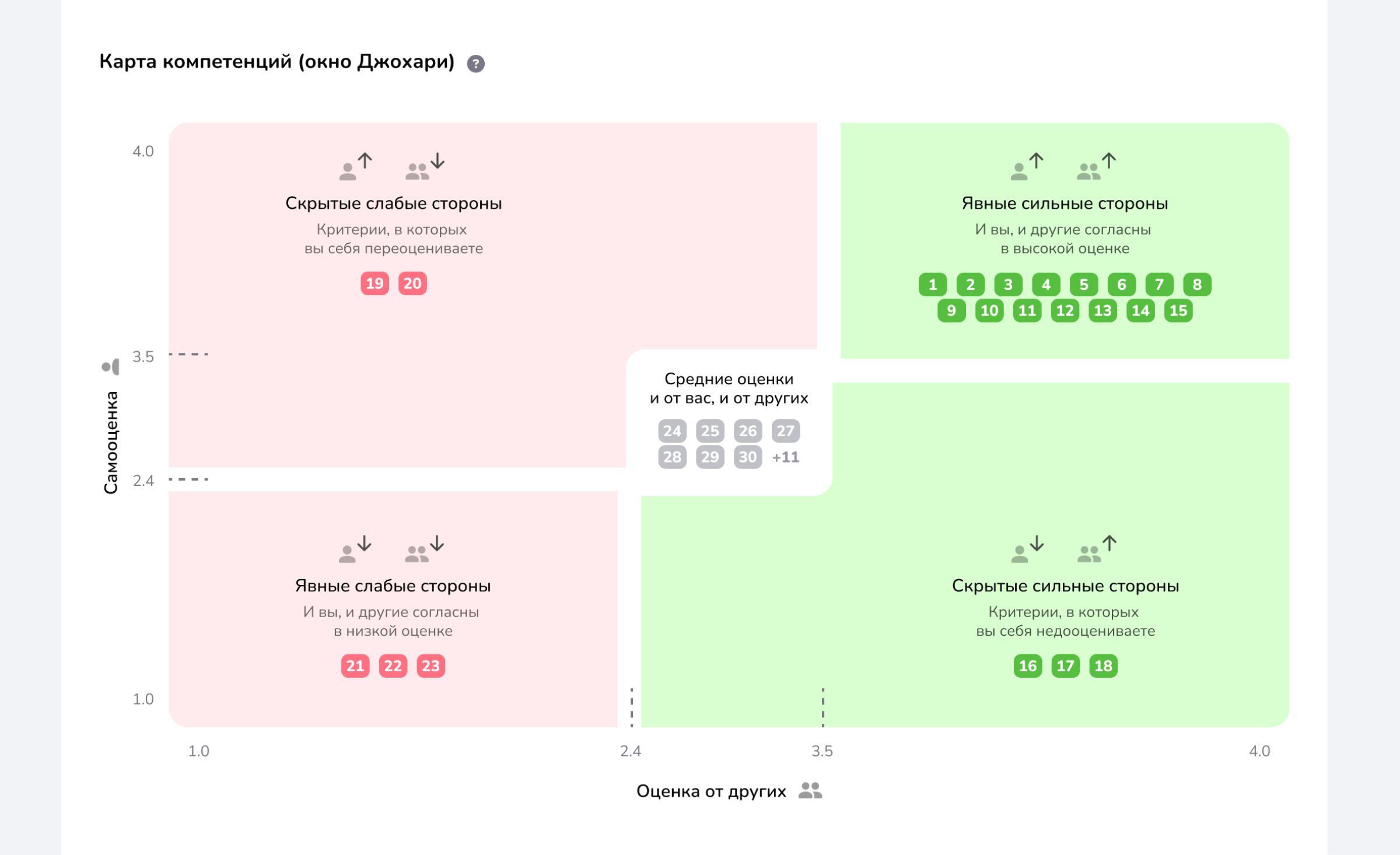 Поэтому в части отчета «Карта компетенций» была создана средняя зона, которая соответствует одинаковому взгляду на выраженность компетенции со стороны сотрудника и его внешнего окружения. Сюда попадают компетенции, которым сам сотрудник и его окружение присвоили средние баллы.