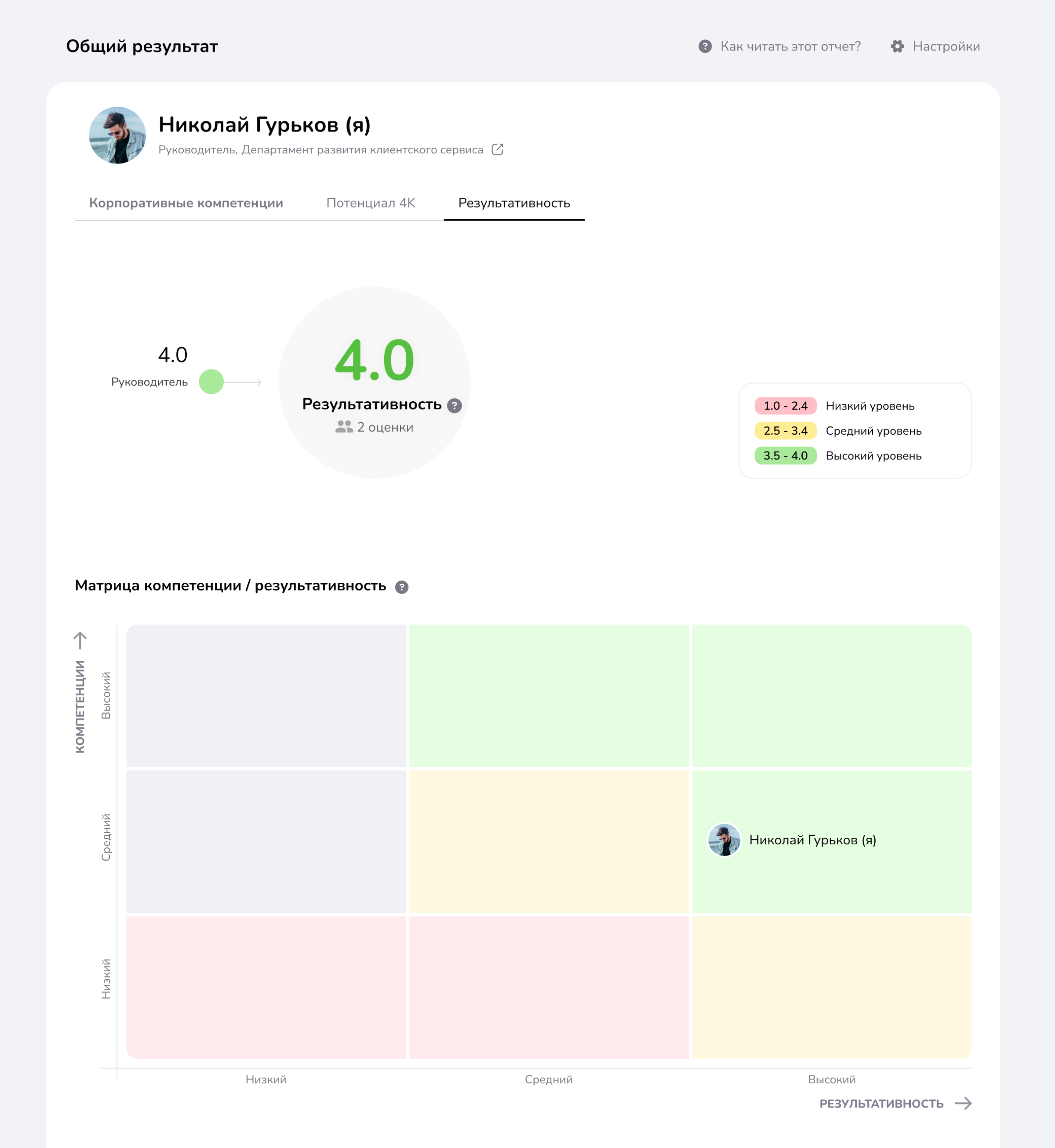 Матрица помогает структурировать наблюдения о том, насколько демонстрируемые компетенции помогают сотруднику достигать результата, а также насколько он следует утвержденным в компании стандартам и моделям поведения.