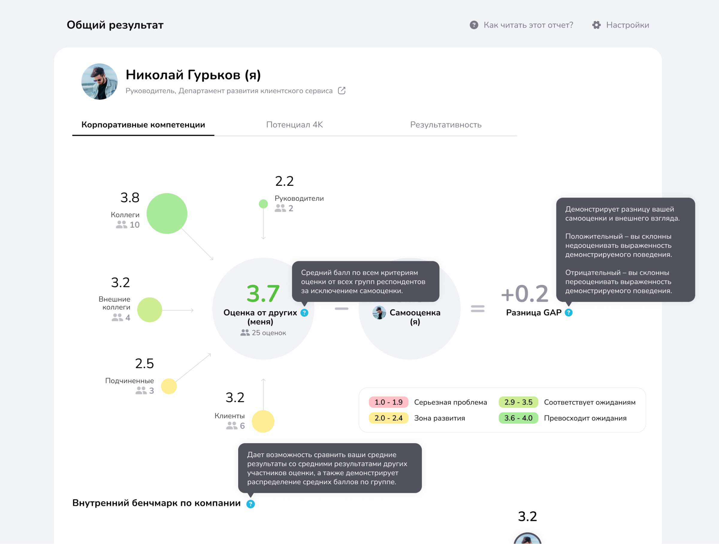 Встроенные подсказки, онбординг-экраны и легенда помогают участнику оценки 360 легко и быстро понять свои результаты и выбрать приоритеты развития.