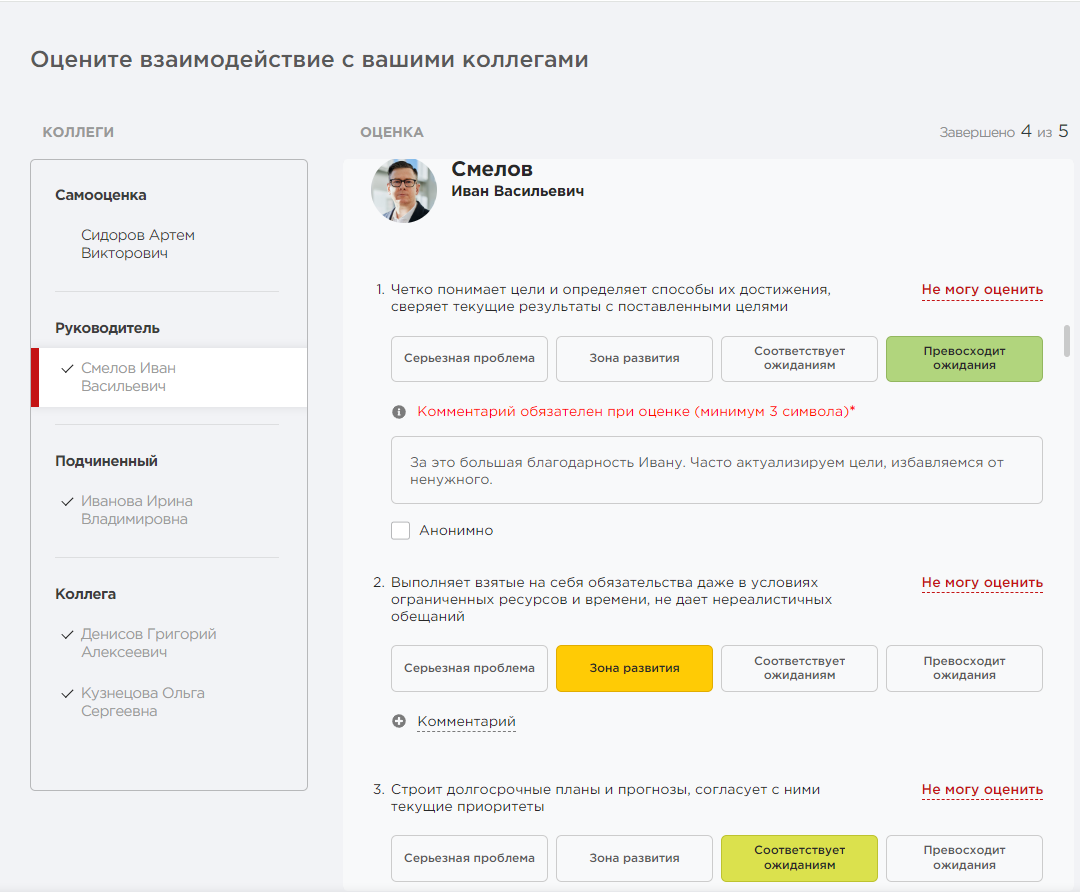 Одно из ключевых преимуществ платформы — анонимность, система скрывает Ф. И. О. сотрудников и их роли. Поэтому люди могут не бояться давать правдивые ответы.