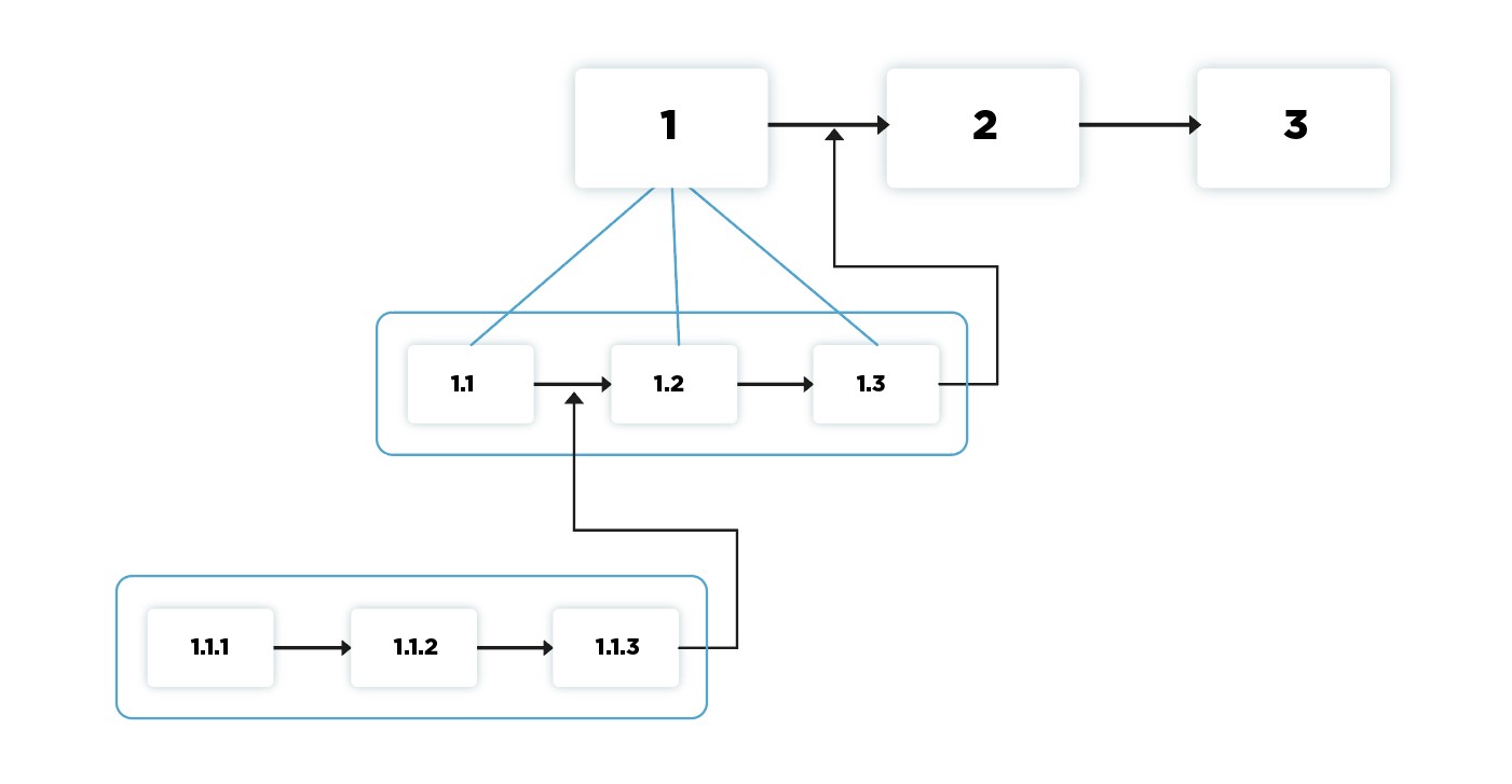 - Второй уровень – это подпроцессы по отношению к процессам первого уровня. Для их обозначения используются цифры 1.2.1, 1.2.2, 1.2.3 и так далее.